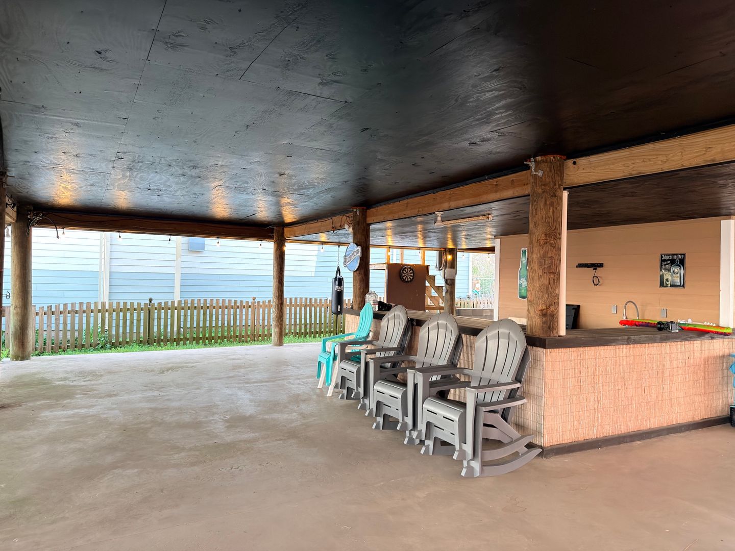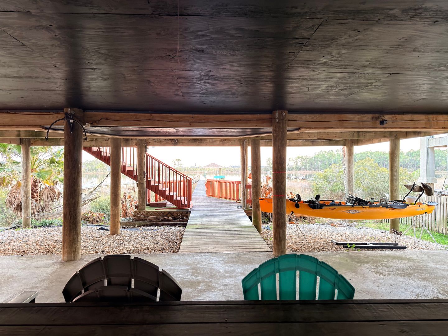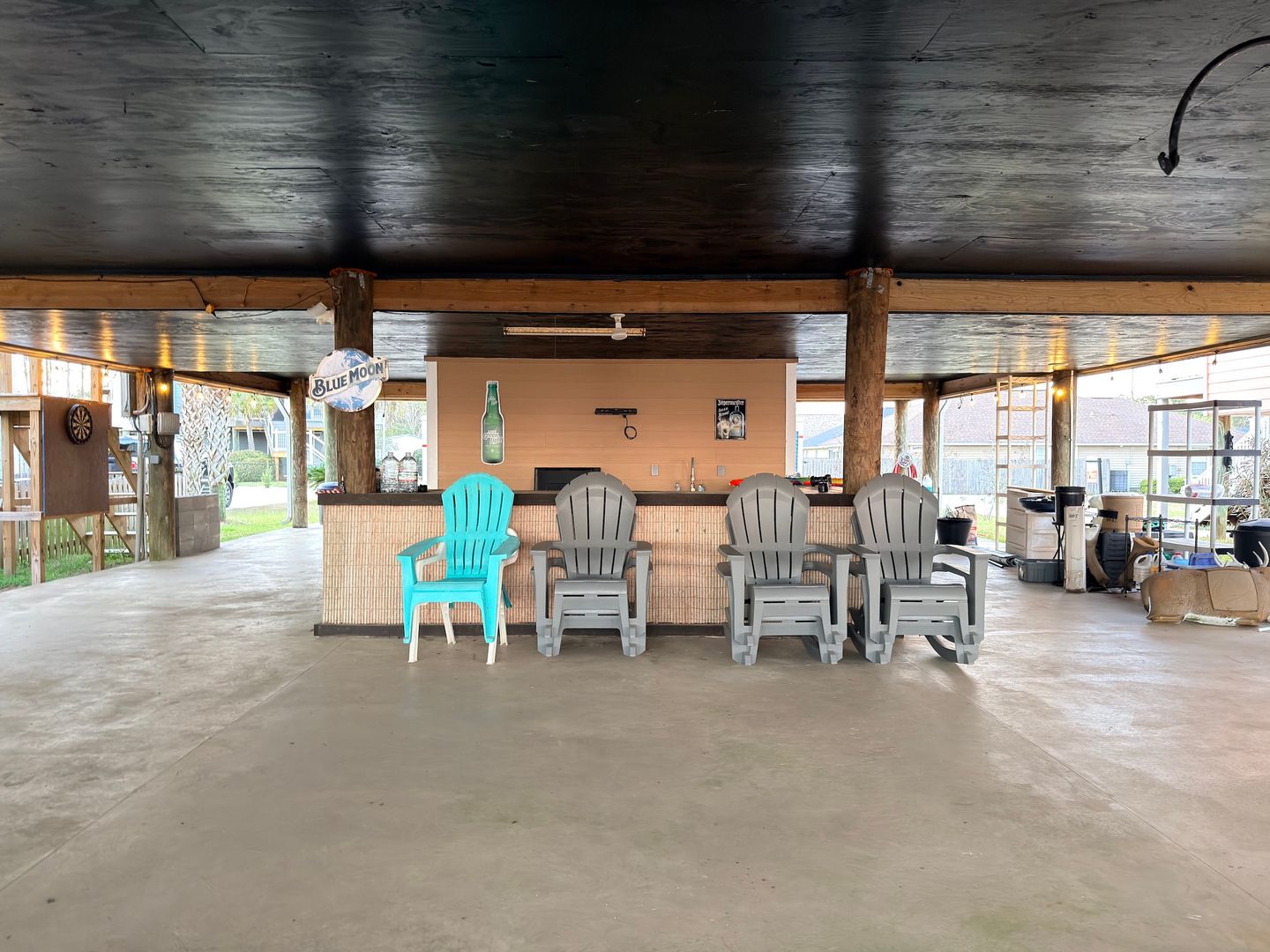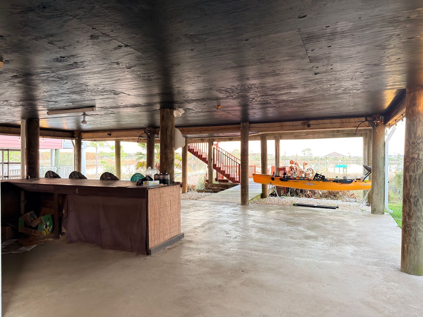 Below the home, a covered ground-level entertaining area with a tiki bar, additional storage, and steady bay breezes creates an ideal setup for waterfront gatherings.