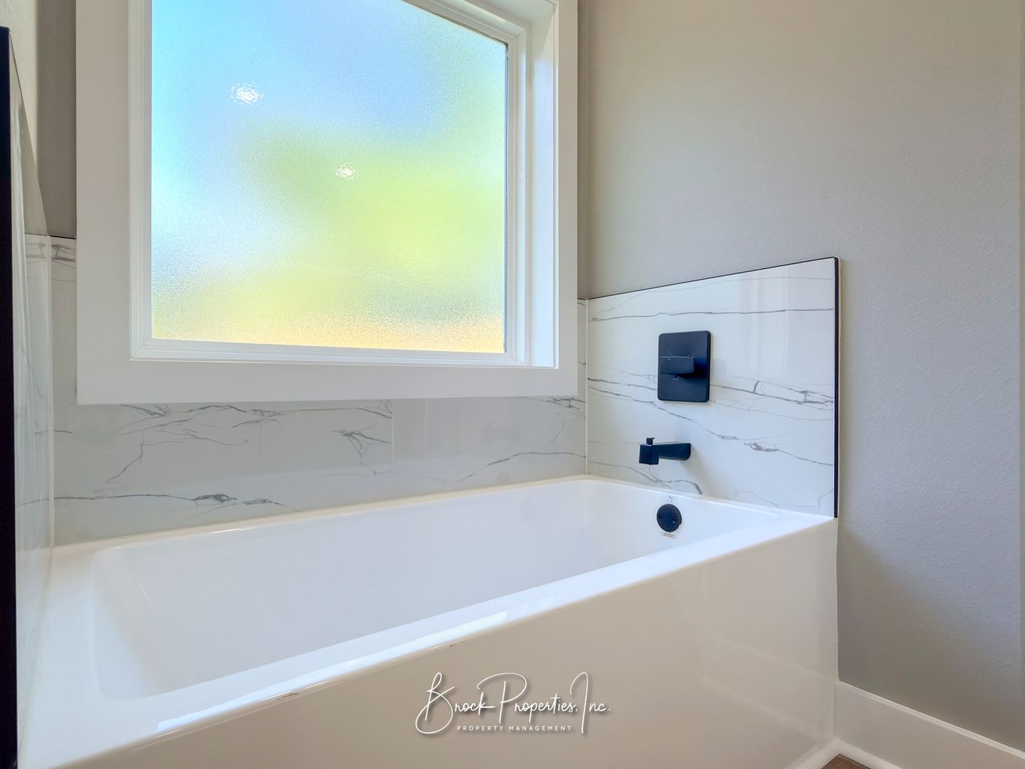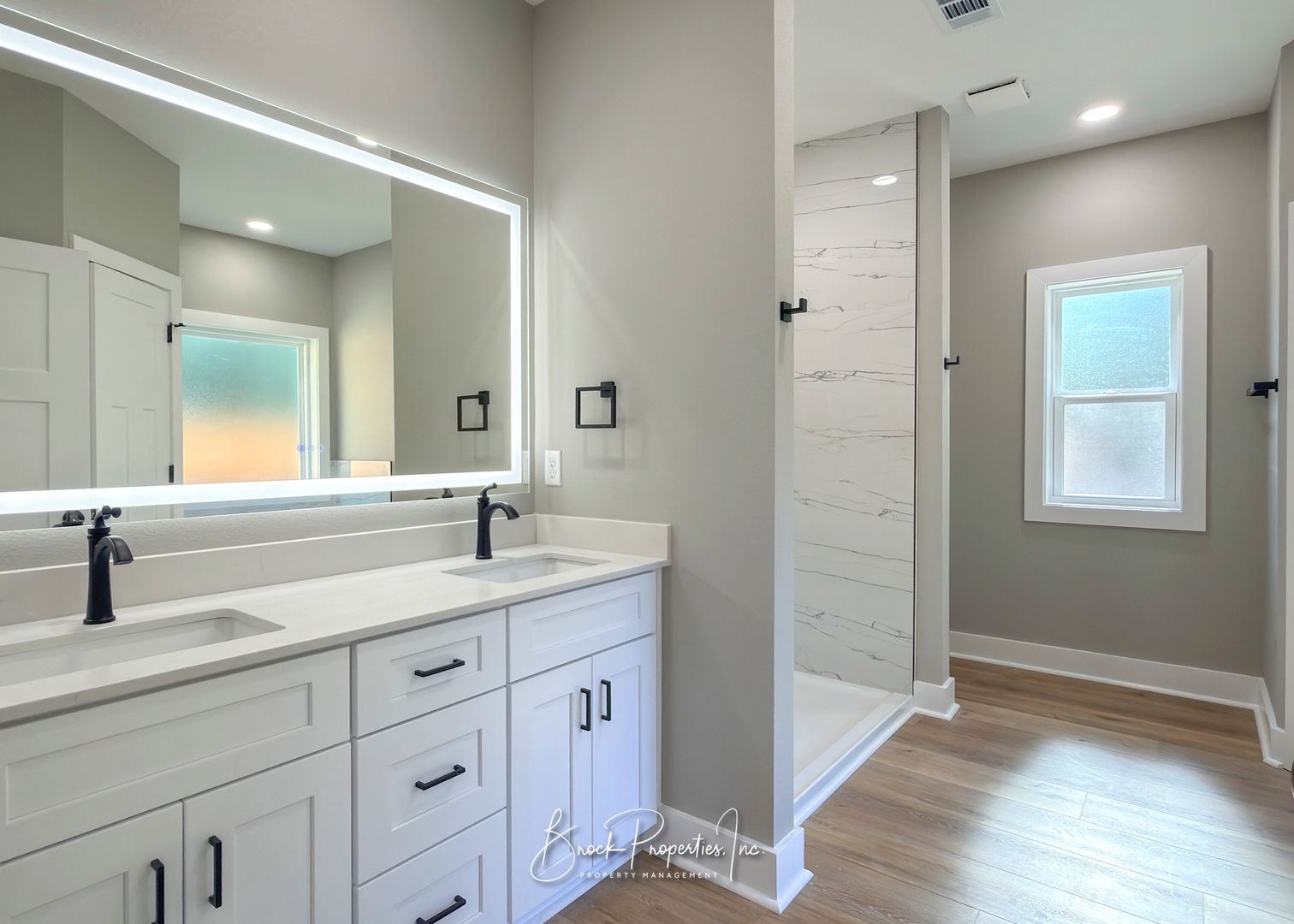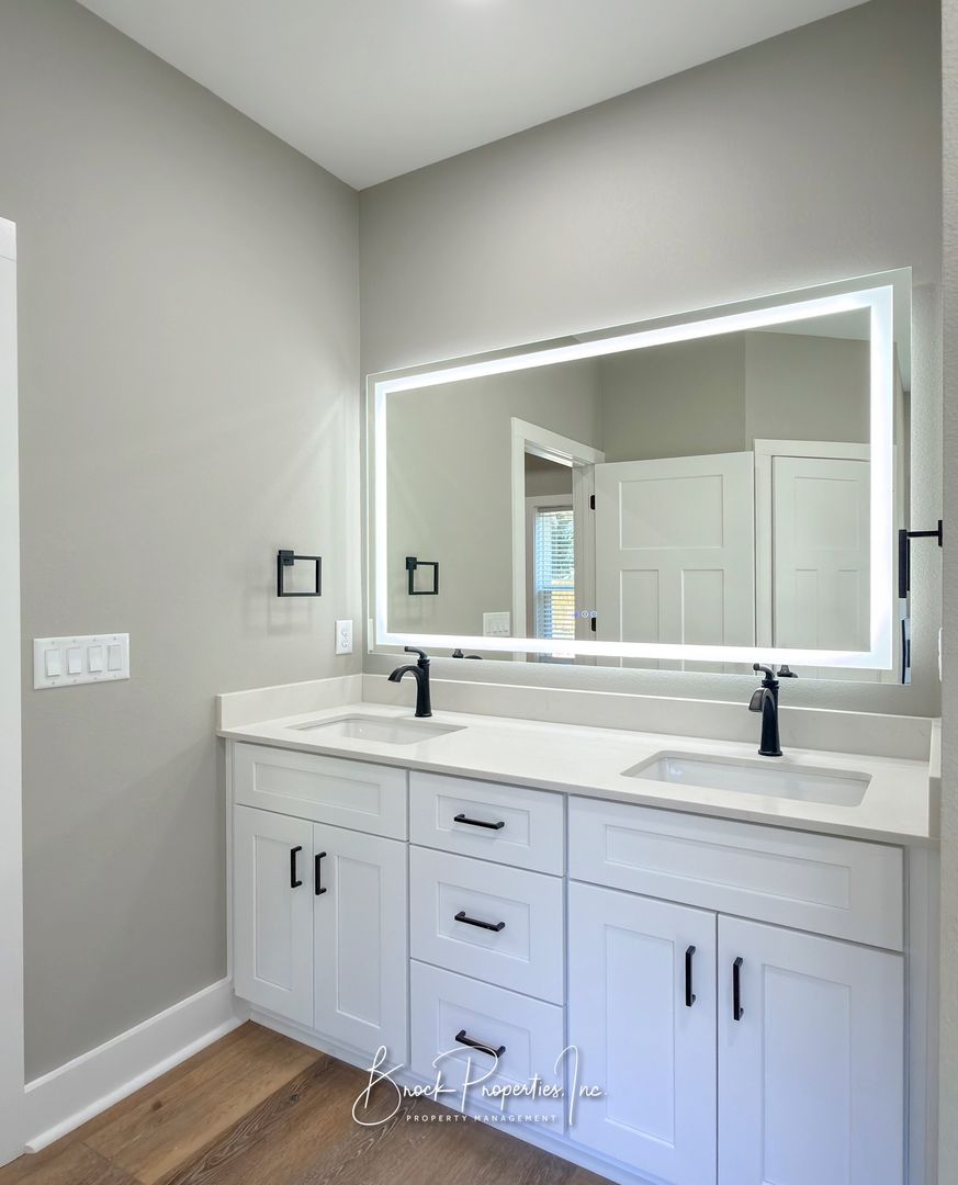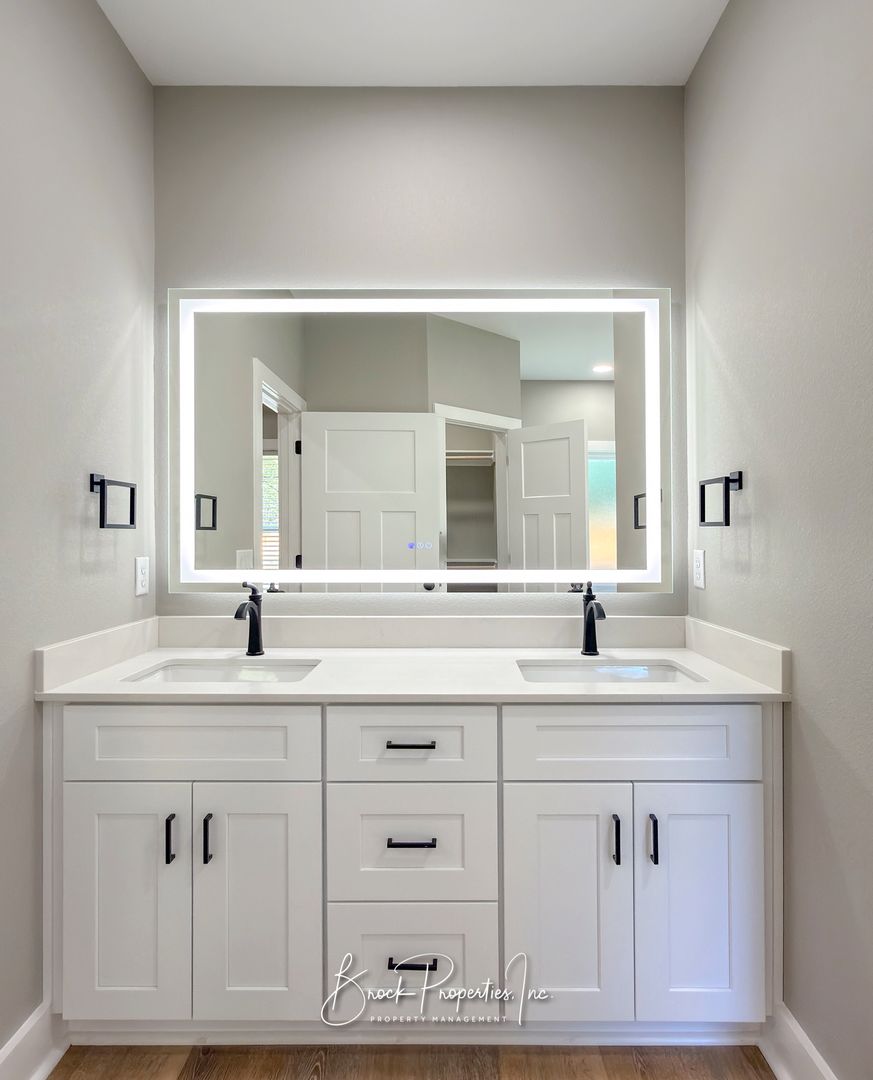 The spacious primary suite features dual vanities, recessed lighting, an LED anti-fog mirror, tiled walk-in shower, garden tub, and two walk-in closets. A large textured glass window provides excellent natural light with privacy. Additional features include a large laundry room with hookups, energy-efficient construction, and a privacy-fenced backyard with remaining sod coming soon.