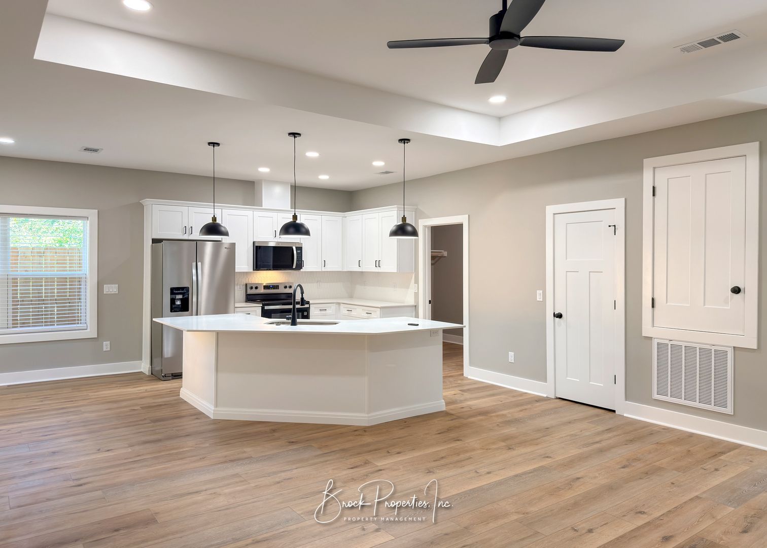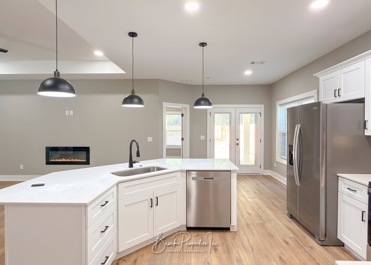 The corner kitchen includes white quartz countertops, white cabinetry, stainless steel appliances, tile backsplash, pantry, and an island with breakfast bar overlooking the great room with a cozy electric fireplace. The dining area opens through French doors to a private covered patio.